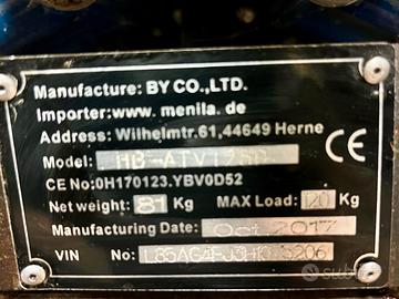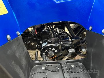 Nitro Motors HB- ATV 125 cc. ottobre 2017, blù , completo di fari e frecce, solido paramucche e porta pacchi anteriore in tubolare di metallo, uguale porta pachi posteriore , in ordine, pulito ben tenuto, parte e va , acceleratore automatico con levetta, frizione centrifuga, potrebbe aver bisogno di qualche messa appunto, ingombro: cm. 135 x 85. h. 93 peso 81 , disponibile per visione e prova, e avrei anche filmato dove si vede in marcia.