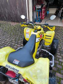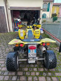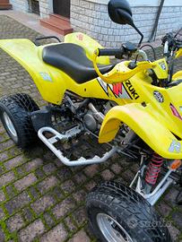 Quad suzuki LTZ 400 anno 2004, acquistato due anni e mezzo fa per sfizio. Da allora utilizzato si e no una decina di volte per uso stradale. Distanziali, gomme stradali, pedane sportive, scarico OMOLOGATO Leo vince (sound bellissimo) con tutto il KIT dei vari dbkiller. Fornisco anche scarico e pedane originali + kit tagliando acquistato l'anno scorso. Vendo per completo inutilizzo (ho 50 anni e la schiena non mi consente piu di usarlo neanche per sfizio). non chiedetemi i km perche non ne ho idea (quello indicato è stimato perche non ha strumentazione). So che ha superato brillantemente la revisione pochi mesi fa.