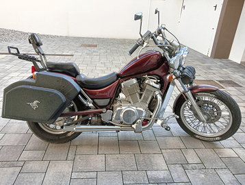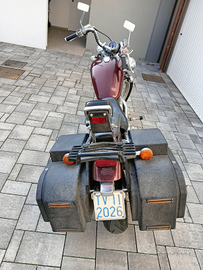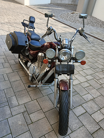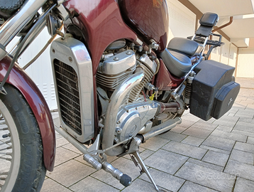 Vendo moto perfettamente funzionante e ben tenuta sempre in garage, revisione fatta ad aprile 2024. Ultimo intervento effettuato: sostituzione batteria con una nuova ed in garanzia, pulizia spazzole motorino di avviamento, ingrassata/oliata generali alle parti importanti. Sempre manutenzionata ogni anno da meccanico di fiducia. Olio e filtro motore appena cambiati. Due anni fa cambiate tutte le cannule di freni e frizione e serbatoio, cavo tachimetro, ammortizzatori anteriori con paraolio rifatti, freno anteriore e pastiglie rifatto, scarichi finali, tutto nuovo. Pneumatici cambiati con nemmeno 8.000 km di uso. Funzionamento tutto perfetto, nessun problema di accensione, carburazione, cigolii, elettrico, spie, luci, altro. Moto customizzata con: baulotti artigianali laterali (molto capienti anche per caschi integrali), specchietti rettangolari slim, scarichi finali aperti, pedane avanzate, fanali anteriori ausiliari aggiunti, portapacchi posteriore. Offro massima serietà. Vendo, dopo aver speso più di 1500 euro per renderla in queste condizioni, per arrivo figlio e mancanza di spazio. Moto registrata a FMI come storica. Bollo di soli 15 euro all'anno