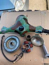 Vendo alcuni ricambi vespa originali Piaggio come si vede in foto, manubrio farò tondo 3 Marcie completo del suo faro, volantino completo del suo campo magnetico e bobina ET3 originali, collettore percarburatore 22/24 più trombetta in plastica,