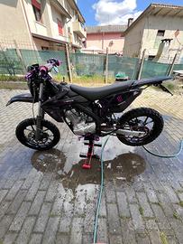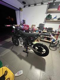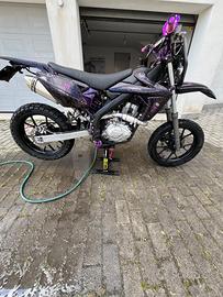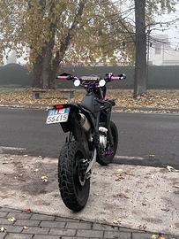 Rieju marathon 125 A.C. motard raffreddata ad aria, monta: gomme al 90%, motorino di avviamento sostituito nuovo, pastiglie freni al 60%, forcelle revisionate a dicembre, catena D.I.D e pignone da 15 denti. modifiche estetiche: faro angel eye viola e led viola in corrispondenza delle due ruote, manubrio Rental viola, comando gas viola in ergal come anche padane, leva del cambio e della frizione, manopole domino. La moto é perfetta, utilizzata sempre e solo su strada, con l'ultimo tagliando( olio, filtro olio, candela e batteria) fatto a 25000km e disco frizione appena rifatti. Posso anche farvela vedere e provare nel caso siate interessati. Scrivetemi pure per informazioni, il prezzo é trattabile, é basso solo perché ho fretta di venderla.