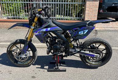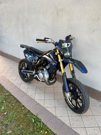 Vendo Rieju Mrt Pro 50 Motard del 2011. La moto ha circa 18 mila chilometri. Tenuta sempre in ottime condizioni. Gruppo termico cilindro e pistone nuovi ancora in rodaggio, con cambio olio motore eseguito. Gomme al 70%. La moto monta: gruppo termico DR 50 accensione Ducati frizione rinforzata Top pacco lamellare VL18 Malossi carburatore Polini 19 EVENTURI collettore Polini 28 360° filtro aperto Malossi scarico completo Polini gas rapido disco anteriore maggiorato manopole Domino leve freno/frizione oro v-face Led porta targa pieghevole nero specchietto basso omologato mini frecce Led con impianto a parte omologate impianto Led RGB forcelle Marzocchi a stelo rovesciato manubrio anodizzato viola paracolpi Domino grafiche personalizzate cerchi in lega personalizzati con pellicola oro Inoltre in dotazione regalo kit getti carburazione minimo/massimo, secondo filtro invernale, secondo kit di plastiche bianche originali, scarico originale, pompa freno nuova oro mai usata, frecce a Led nuove e altri pezzi. Per maggiori informazioni contattare il +39 3287360101. Prezzo leggermente trattabile dopo visione. Vendo per passaggio a macchina.