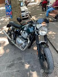 Royal Enfield continental Gt 650 del 2021, colorazione British Racing Green, monta diversi accessori come Specchietti, frecce led anteriori e posteriori, porta targa rialzato, stop a led, manopole in cuoio, mini parabrezza originale RE, paramotore originale RE, scarico Leovince, sella biposto, pedane passeggero. Disponibili anche tutti i pezzi originali.