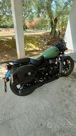 fascia termica colore oro per proteggere il guidatore da eventuali bruciature, doppia valigia rigida originale "royal enfield", staffe di supporto per bauletto posteriore, frecce nuove mai montate, cupolino nero trasparente "royal enfield" anteriore e retina copri faro in ferro nero che conferisce carattere alla moto.