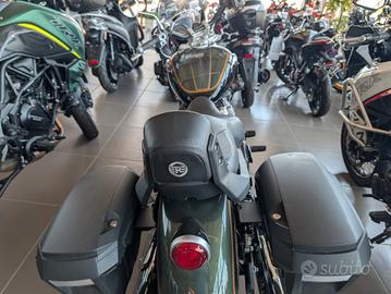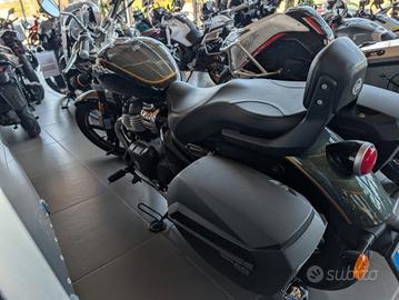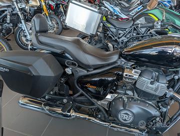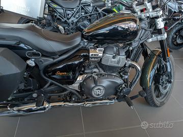 La Royal Enfield Super Meteor 650 (2025) è una cruiser premium con motore bicilindrico parallelo da 648 cc (47 CV, 52,3 Nm), omologazione Euro 5+ e 6 marce. Caratterizzata da una sella bassa a 740 mm, forcella a steli rovesciati da 43 mm e peso di 241 kg in ordine di marcia, offre una guida confortevole e adatta ai viaggi. Il serbatoio è da 15,7 litri. < button jsuid="v22e5e_i" tabindex="0" data-amic="true" data-icl-uuid="8d49bac8-941a-407b-957f-ff64695e92d3" aria-label="Royal Enfield (+4) - Visualizza link correlati" class="rBl3me IWyTpf pjvauc" jsaction="click:&v22e5e_g|S9kKve;mouseenter:&v22e5e_g|sbHm2b;mouseleave:&v22e5e_g|Tx5Rb" data-wiz-attrbind="disabled=v22e5e_g/C5gNJc;aria-label=v22e5e_g/bOjMyf;class=v22e5e_g/UpSNec" data-ved="2ahUKEwjxmuu72P6TAxV58gIHHYngCRoQye0OegQIARAD" data-hveid="CAEQAw" > < /button>Caratteristiche Principali e Ciclistica< button jsuid="v22e5e_t" tabindex="0" data-amic="true" data-icl-uuid="4f95e41b-78d7-41d6-9695-61cf700f51fe" aria-label="Visualizza link correlati" class="rBl3me" jsaction="click:&v22e5e_r|S9kKve;mouseenter:&v22e5e_r|sbHm2b;mouseleave:&v22e5e_r|Tx5Rb" data-wiz-attrbind="disabled=v22e5e_r/C5gNJc;aria-label=v22e5e_r/bOjMyf;class=v22e5e_r/UpSNec" data-ved="2ahUKEwjxmuu72P6TAxV58gIHHYngCRoQye0OegQIAhAB" data-hveid="CAIQAQ" >< svg fill="currentColor" width="12px" height="12px" focusable="false" xmlns="http://www.w3.org/2000/svg" viewBox="0 0 24 24">< /svg>< /button>Motore: Bicilindrico in linea 4 tempi, raffreddato ad aria/olio. Potenza/Coppia: 34,6 kW (47 CV) a 7.250 giri/min; 52,3 Nm a 5.650 giri/min. Telaio: Tubolare in acciaio a culla. Sospensioni: Anteriore a forcella rovesciata (Upside Down) da 43 mm (corsa 120mm); posteriore a doppio ammortizzatore con precarico regolabile (corsa 101mm). Freni: Disco anteriore da 320 mm e posteriore da 300 mm, entrambi con ABS. Ruote: Anteriore 19 pollici (100/90), Posteriore 16 pollici (150/80). Peso: 241 kg (in ordine d