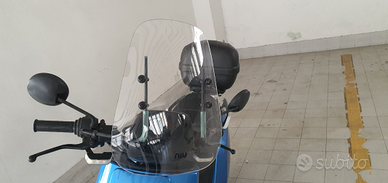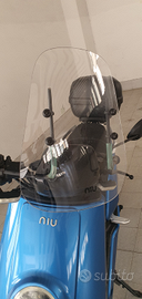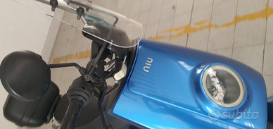 Scooter elettrico Niu 125 con le 2 batterie, caricatore, parabrezza e bauletto. Colore azzurro metallizzato.