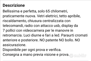 Bellissima e perfetta, solo 65 chilometri, praticamente nuova. Vetri elettrici, tetto apribile, riscaldamento, chiusura centralizzata con telecomandi, radio con attacco usb, display da 7 pollici con videocamera per le manovre in retromarcia. Luci diurne e fari a led. Paraurti cromati anteriore e posteriore. NO patente NO bollo. NO assicurazione.