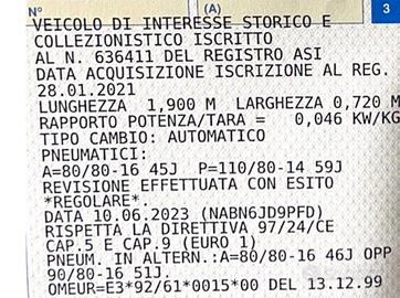 Come nuovo, con tantocdi lista dettagliata di tutto cio che e’ stato sostituito restate 2025 , ruote nuove , tutto in ottime condizione . Documenti per mezzo di interesse storico , con prezzo assicurazione calmierato.