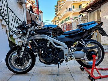 Bellissima Triumph Speed Triple 955i. Anno 2003. Colorazione Jet black. Iscritta A.S.I. Quindi di interesse storico e collezionistico, già riportato sul libretto di circolazione. Tassa di possesso ridotta al 50%. Assicurazione ridotta. Tenuta in modo maniacale e custodita sempre in garage. Km 35.000. Lavori certificati, eseguiti pochi mesi fà in officina della rete Triumph: Regolatore di tensione originale Triumph 390? Kit trasmissione Ognibene + catena 530 d.i.d. serie oro 260? Batteria nuova al litio 120? Pasticche freni posteriori 40? Pulizia ed allineamento corpi farfallati 200? Stepper motore 40? Connettori benzina in metallo (sostituzione gratuita per richiamo della casa madre). Filtro aria 45? Mappatura centralina per scarico sportivo MIVV alto 150? Gomme nuove Dunlop mk3 310? Freni anteriore al 70%. Ultimo tagliando con olio Bardahl 10w40 + filtro olio + olio freni + liquido refrigerante fatto il 06/11/2025. Revisione effettuata il 10/09/2025 Inoltre insieme alla moto verranno consegnati anche : terminale di scarico originale come nuovo,libretto uso e manutenzione,certificazione Triumph sull'origine della moto pagato 90? ,custodia con attrezzi originali Triumph e frecce color arancione originali. La moto deve solo essere guidata. Vendo o scambio/permuto con T-max 500 ultima serie,530 con chilometraggio simile e di pari valore. Per qualsiasi informazione potete contattarmi.