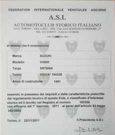 Vendo moto Suzuki Vx 800 anno 1991 marciante con certificato ASI. Molti lavori eseguiti e qualche altro da fare, revisione valida fino al 2027. Esente bollo tel 3892434890
