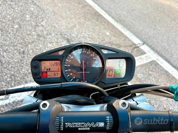 Naked con il DNA da supersportiva: monta il motore della GSX-R 600 depotenziato, il che la rende docile ai bassi ma esplosiva quando la lancetta sale.