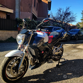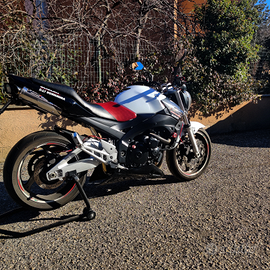 Suzuki gsr 600 depotenziata a libretto (depo 25kw). Segna 48000km ma montando un pignone con due denti in meno il contachilometri totale segna più chilometri percorsi di quelli reali. A 40000 è stato fatto un tagliando completo ed è stata sostituita inoltre la catena con una della DID serie oro e sono state cambiate le candele. L'ultimo tagliando generale lo ha fatto a 46000 e con l'occasione è stata montata una pompa radiale. La moto monta svariati accessori, come visibile nelle foto; proverò ad elencarli tutti ma sicuramente dimenticherò qualcosa: