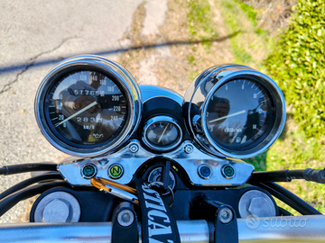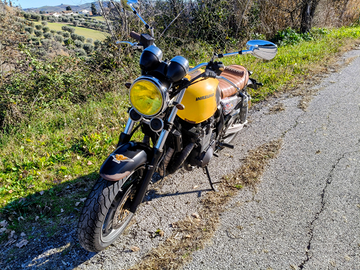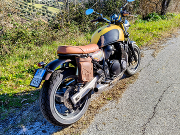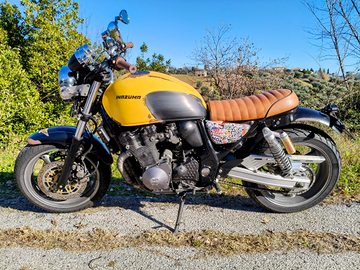 Vendo Inazuma 750 trasformata cafè racer perfettamente funzionante appena effettuato cambio olio, filtro olio, filtro aria, batteria nuova, revisione carburatori con sostituzione dei quattro collettori di aspirazione e cordina aria e sostituzione pneumatici Dunlop Mutant, verniciatura in stile rat con ruggine finta realizzata con apposito prodotto, sella realizzata su misura in vera pelle e chiusura con la stessa chiave d'accensione, scarico Mass omologato, revisionata ad agosto 2025. La cedo completa di scarico originale, pedane passeggero e cavalletto centrale.