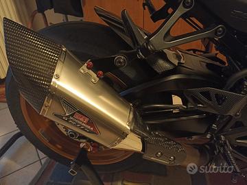 Gsx R colorazione Phantom con scarico Yoshimura corto, più bello del nero lungo. Accessoriata con vaschette olio Rizoma, paratacchi Carboniomania, portatarga e parafango in carbonio Lightech, tendicatena, paraleve e paramotore Gilles dedicati Suzuki, pompa freno Brembo RCS Corsacorta, leva frizione regolabile Gilles, cupolino doppia bolla fumè GSX-R, tank pad e cover tappo serbatoio sempre Suzuki, emulatore valvola allo scarico Healtech, filtro aria Sprintfilter P08 e batteria al litio Skyrich; ci sono quindi circa 2000 euro di accessori. Sono il secondo proprietario e ho effettuato personalmente tre tagliandi. Altri due precedenti tagliandi effettuati presso Ceriani Moto dimostrabili da sito Suzuki. Gommata con Michelin Power GP appena montate. Due uscite in pista da parte mia e nessuna da parte del primo proprietario. Moto perfetta, "vive" in casa con me. Ho tutte le parti originali, un codino monoposto nero lucido e una staffa reggiscarico Yoshimura molto bella. Bollo e revisione ok.