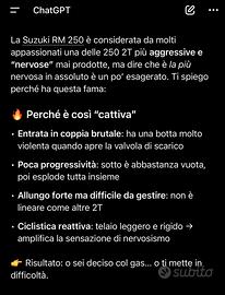 Suzuki rm 250 2 tempi 2002 ufficiale valenti con certificato originale Tutta originale con anche le sue plastiche oltre a quelle restyling in foto. Ultimo modello prodotto fino al 2008 Questa annata 2002-2004 è definita la più nervosa 250 2t, infatti dal 2005 hanno ammorbidito l’erogazione modificando la valvola di scarico La marmitta è stata appena rigonfiata Non so dire le ore dato che è stata ferma parecchio tempo ma il pistone non dovrebbe averne tante, il motore gira bene ha buona compressione ed è molto reattiva. Valuto anche possibile scambio anche con 125 250 e 450 sx sxf rmz yz yzf cr crf kx kxf tc.