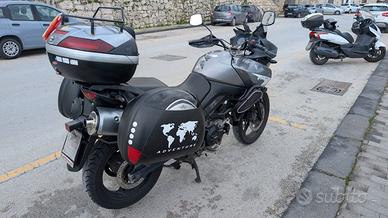 Vendo Suzuki V Strom 650DL DEL 2008 per cambio moto CON 88328 Km La moto comprende set tre valige di cui quello centrale fornito di porta pacchi mentre quelle laterali hanno come modello GIVI 40 LITRI IL cruscotto contiene sensore marce + N° 2 prese usb + un termometro temperatura + voltometro. La moto è dotata di frecce a led e gommata nuova di appena mese di Giugno luci a faro a led. La moto è sempre stata tenuta bene, è stata tagliandata ogni anno a prescindere dai km prezzo 3500,00 trattabili