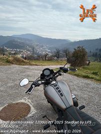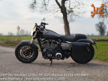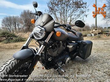 *SWM Stormbreaker V 1200 cc* Questo modello con omologazione EURO5 è nato dallo stesso progetto della Harley Davidson 48 1200cc acquistato da Shineray e commercializzato (con alcune migliorie) da SWM Italia. La moto in vendita fa parte del Progetto Stardust (polvere di stelle) by LFS GARAGE realizzato su moto perfetta e come nuova utilizzata per la progettazione di accessori LFS Garage, usata per esposizione e fotografie pubblicitarie, è un pezzo unico frutto di un attento lavoro artigianale, tutto eseguito a mano. immatricolata: Marzo 2025 bollo pagato fino a Marzo 2027 garanzia SWM fino a Marzo 2027 2 tagliandi eseguiti presso officina specializzata SWM ultimo cambio olio appena eseguito (10/04/2026) presso PassioneMoto23 (Crema) Accessori: * verniciatura speciale by LFS GARAGE in varie tonalità di grigio metallizzato opaco e filetti arancioni * sono stati riverniciati: parafanghi, serbatoio, fianchetti, cover filtro aria, para catena, cupolino, Borsanica * Speciale sella by AS Design fatta su misura in collaborazione con LFS GARAGE (e la sella originale) * cinghia serbatoio by LFS GARAGE in acciaio inox e vero cuoio tinta (all'occorrenza asportabile in 2 minuti) * cover motore LFS GARAGE in acciaio cromato (e le cover originali) * Cupolino LFS GARAGE in acciaio inox, pezzo unico realizzato a mano e verniciato in tinta (asportabile in 5 minuti) * KIT LFS GARAGE con piastre per avvicinamento pedane pilota (date in dotazione per chi è di bassa statura) * BORSANICA destra by LFS GARAGE con verniciatura intinta con la moto e sgancio rapido con serratura * possibilità di avere anche i seguenti accessori (valutare separatamente): - Sissybar a sgancio rapido (si monta e smonta in pochi secondi) con schienale imbottito, maniglie passeggero e portapacchi. - Borsa Horse sinistra con sgancio rapido con serratura (nuova). prezzo non trattabile non si accettano scambi solo vendita. Disponibili altre foto via WhatsApp. La vendo per procedere con un nuovo progetto.