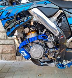 Vendo Tm smr 125 del 2019 a carburatore (ultima annata). Motore rifatto completamente presso concessionario ufficiale (pistone, biella, tutti i cuscinetti...) dimostrabile con fattura e foto. Blocco attualmente con 40h totali dal rifacimento. La moto monta praticamente la totalià di componenti aftermarket aquistabili. Motore: -Testa vhm con inserto 11.4 -Pancia hgs mx -Silenziatore bud racing in carbonio -Biella trm carnago -Pompa acqua maggiorata sm project -Squish preciso a 0.9 -Filtro aria maggiorato -Candela br9eix -Estetica: -Plastiche nere -Paraforcelloni neri -Grafiche glitter Sm project: -Carter frizione -Tamponi ant. e post. -Registri catena blu -Tappo pompa frizione -Tappo pompa freno post. Alba motor parts: -Pedane -Cavalletto -Pedale freno post. -Cavallotto freno post. -Tappo carico olio -Kit viti ergal blu -Tappo serbatoio -Manubrio ergal blu -Corona ergal blu Carbonio cmt (~1000€): -Cover serbatoio -Paraspruzzi post. -Paramotore -Piedini forcella -Parapompa frizione -Parapancia -Parapignone -Paratelaio tekmo racing. -Leva frizione blu nr team -Leva freno ant. blu -Leva cambio blu nr team -Manopole pro taper -Vaschetta pompa freno blu -Fermacavo tubo freno in ergal blu -Staccamassa in ergal blu -Sfiato serbatoio blu -Copriviti blu -Diverse rondelle in ergal blu -Tappini valvole aria blu -Vite minimo blu -Porta tarqa dbr -Paracolpi neken -Sella wdracing -Recupero fluidi personalizzato by Soat 3D -Tubi carburatore blu -Tubi radiatore blu -Pellicola carbonio forcelle -Cruna catena, pedivella e diverse viti verniciati a polvere (blu) -Tabella piatta -Faretto led ant. e post. -Clacson -Tachimetro digitale -Termometro koso -Contaore + Batteria, statore e reg. tensione NUOVI Ciclistica: -Pompa Bremo 16×18 radiale -Pastiglie freno ant. e post. nuove -Gomme Metzeler m9rr nuove -Catena regina rx3 nuova -Corona 44 denti -Pignone 13 denti Moto impeccabile, perfetta, pari al nuovo. Usata sempre con criterio. Sempre fatto cambio olio ogni 20h.