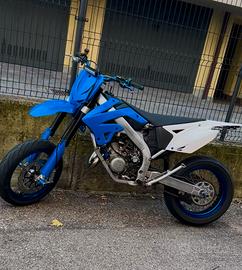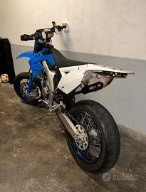 Ciclistica Tm smr : piedini radiali, mono tarato motard, cerchi Excel, pompa anteriore brembo, pinza anteriore brembo, disco freno moto master nuovo, pastiglie anteriori e posteriori nuove+spurgo olio, pignone, corona, catena nuovi, porta targa dev & craft, frecce micro led, impianto faro a led+sensore temperatura e piatta cross, cambio olio ogni 15h, pancia e silenziatore hgs, radiatori maggiorati.