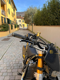 Recentemente sostituiti: tutti i cuscinetti del motore (banco e cambio) + tutti i paraoli del blocco nuovi, cilindro ricromato da trt quindi sel.A + sostituzione delle 2 valvole di scarico e dei due astucci a rulli del movimento, albero rimbiellato con biella wossner, sostituito cestello frizione (no ingranaggi) + sostituiti dischi frizione e pompa e attuatore frizione idraulica (originale ma nuovo), impianto elettrico semplificato a batteria che viene ricarica sempre dalla moto con accensione da cross e convertita l'illuminazione a led. Gomme Diablo rosse nuove.
