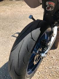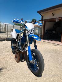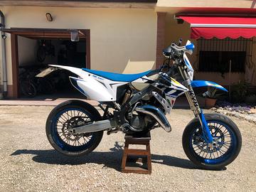 para telaio in carbonio tekmo, pompa frizione maggiorata con il suo tappo entrambi di SM project, para colpi renthal, telaio lucidato a specchio, serbatoio pompa freno anteriore in ergal abbinato col tappo serbatoio, portatarga pieghevole e freccie LED mini, a livello meccanico è stato rifatto completamente il motore (disponibili fatture del meccanico) al momento ha 31 ore all'attivo, sono stati sostituiti sia frizione che campana frizione e tutti gli ingranaggi lato frizione, dal rifacimento del motore è sempre stata usata BENZINA 100 OTTANI di massima qualità e olio bardhal kts competition, è stata fatta una mappa da TM a pesaro, tutto il kit trasmissione è stato sostituito da poco, le gomme sono del mitas sostituite circa a febbraio (sono nuove), ha un silenziatore scalvini full carbon, prima revisione effettuata il 12/05/25 valida fino al 2027, cambio olio effettuato ogni 12 ore con bardhal 10w40, la moto è stata tenuta maniacalmente è sempre tenuta in garage con cura, la moto è omologata per 2 (anche se in foto non ci sono le pedaline ma le fornisco), fornisco tutti i pezzi originali e sostituiti. la moto in tutto ha 17 mila km ovviamente il motore essendo stato rifatto non presenta lo stesso chilometraggio del telaio.