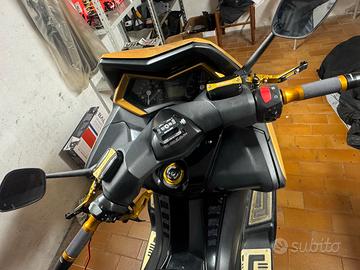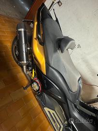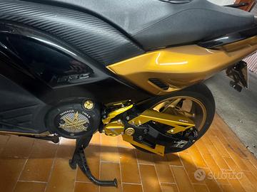 Per motivi personali vendo Tmax 530 2012 no ABS appena stato riverniciato completamente come si vede dalle foto Oro e centrale Nero, attualmente in carrozzeria lo ritirerò venerdì pomeriggio o sabato. Monta scarico Leovince, variatore e semi puleggia Malossi, torsion controll CS Moto Bologna, porta targa sportivo, kit full led sequenziale, filtro sportivo malossi e altri accessori dettagliati oro. Appena ritirerò lo scooter aggiungerò foto più dettagliate. Quasi 34.000 km. Cedo anche pezzi originali “ scarico, porta targa “ No perditempo, solamente persone veramente interessate. Prezzo non trattabile. A 6.800€ cedo anche una forcella di ricambio. Per altre foto, info contattatemi in privato.