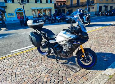 Vendo Yamaha Tracer 9 GT immatricolata 2021, con 35.000 km reali, in ottime condizioni generali. Moto sempre tagliandata presso officina ufficiale Yamaha, tenuta in box, utilizzata per turismo e mai incidentata. Dati principali Marca / Modello: Yamaha Tracer 9 GT Anno: 2021 Km: 35.000 Cilindrata: 890 cc Potenza: 119 CV (87,5 kW) Motore: 3 cilindri CP3 Euro 5 Cambio: 6 marce con quickshifter up/down Trasmissione: catena Peso in ordine di marcia: circa 220 kg Serbatoio: 19 litri Dotazioni di serie (versione GT) Sospensioni elettroniche KYB semi-attive Cruise control ABS Cornering e Traction Control a 6 assi (IMU) Doppio display TFT da 3,5" Manopole riscaldate Cambio elettronico (quickshifter) Modalità di guida selezionabili (Riding Modes) Illuminazione full LED Accessori inclusi Tris di valigie originali Yamaha rigide (laterali + top case) Borse interne morbide per valigie rigide Sella comfort Yamaha Paracolpi tubolari laterali Borsa serbatoio GIVI Tanklock Monta pneumatici Mitas touring force con 4000 km all'attivo Cavalletto centrale. Non scambio
