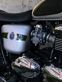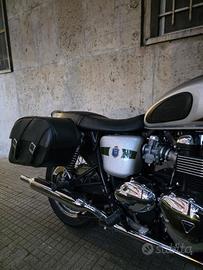 La t100 Diamond è stata prodotta nel 2012 (prezzo di vendita 10500 dollari) in soli 1000 esemplari (di cui 275 sono stati venduti in Nord America) per celebrare i 110 anni dalla prima moto prodotta da Triumph nel 1902, è un'edizione rarissima. La mia è la N° 136, presenta uno stemma commemorativo che raffigura la corona della Regina, tre punti che rappresentano le tre sedi storiche di Coventry, Meriden e Hinckley e il "triangolo" Triumph all'interno della corona. Motore 865cc, 67 cv. Moto dal fascino senza tempo, chiunque la veda la riconosce immediatamente, presenta un'esclusiva verniciatura bicolore dal nome Brooklands Green, verde e argento, e accessori tutti cromati come copricatena, maniglia passeggero, carter e coperchio distribuzione che fanno girare la testa a chiunque la guardi. Riprende perfettamente l'aspetto delle Bonneville degli anni 60 ma è assolutamente esente da tutti i problemi che avevano le vecchie Bonneville. Accensione elettrica, cambio a sinistra, freni che frenano, no ABS, impianto elettrico perfetto, doppio albero a camme in testa, iniezione elettronica anche se camuffata da finti carburatori, forcella da 41mm e sound entusiasmante tipicamente britannico. Moto assolutamente perfetta, nessunissimo lavoro da fare, la uso tutti i giorni, gomme con 700km, batteria nuova, tagliando un anno fa, doppie chiavi e manuali d'uso, completa di borse originali Triumph. Io sono il secondo proprietario. I km sono i suoi reali: ne ha fatti 4000 fra il 2012 ed il 2016, poi è stata accesa una volta al mese per fare una ottantina di km giusto per non farla intorpidire.