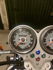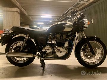 Triumph Bonneville T100 del 2005, conservata, matching numbers, soli 4.000 km, splendida livrea bicolore Jet Black & White ispirata agli anni '60 che hanno reso immortale la Bonneville. Sintesi perfetta tra fascino vintage e affidabilità moderna, con motore twin, dettagli cromati e ruote a raggi.