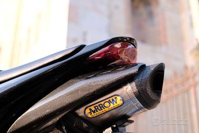 Salve, vendo ad appassionato/a la mia Triumph Daytona 675, anno 2011, livrea nera e oro. La moto ha 45.500 km, da poco è stato eseguito un maxi tagliando comprensivo di pulizia e allineamento corpi farfallati e regolazione gioco valvole, gomma anteriore appena sostituita e posteriore da sostituire; è equipaggiata con: -Quickshifter originale Triumph -Scarico Arrow dedicato, omologato, con dbkiller estraibile -Leva frizione regolabile Triumph -Pompa e leva freno anteriore Accossato -Para leve in alluminio -Porta targa regolabile -Supporti cavalletti alza moto Lightech -Frecce led originali Triumph -Cupolino fumè Zero Gravity -Specchietti Rizoma in alluminio ricavati dal pieno -Raccordi carene, para tacchi, para catena, parafango posteriore e para calore in carbonio. A corredo verranno consegnati: -TUTTO LO STORICO MANUTENZIONE completo di fatture -Una chiave vergine e una di riserva -Terminale di scarico di primo equipaggiamento mai montato e relativo para calore -Unghia monoposto ufficiale Triumph in tinta -Pota targa e frecce posteriori di primo equipaggiamento -Leve freno e frizione di primo equipaggiamento -Bilancieri manubrio di primo equipaggiamento La moto è sempre stata trattata con cura, la manutenzione è stata eseguita regolarmente in Triumph e alla fine di ogni uscita è sempre stata rimessa in garage, sui cavalletti alza moto e coperta da telo. Presenta normali segni di utilizzo dovuti all'età. Non ha bisogno di nessun lavoro da fare, basta girare la chiave e andare. Vendo a 7000 Euro, perché essendo la seconda moto ho poco tempo per utilizzarla.