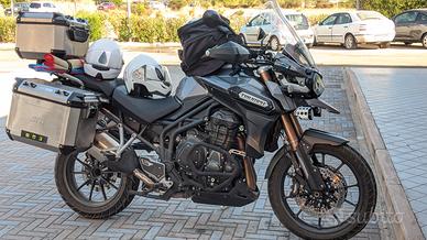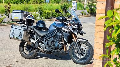 Triumph Tiger Explorer 1215, anno 2012, km 70.000, CV 137. Tre cilindri, Ride-by-wire, ABS disinseribile, traction control, cruise control. Trasmissione a cardano, fendinebbia alogeni. Mono regolabile. Protezione tubolare paracolpi motore, presa 12V vicino al manubrio. Sell regolabile in altezza 837-857. Cavalletto centrale e stampella, portapacchi posteriore, parabrezza regolabile ecc.ecc. Disponibile set valige e bauletto Givi con unica chiave. Borsa da serbatoio. Gomme con 1.000 km, tagliandata regolarmente, veramente a posto.