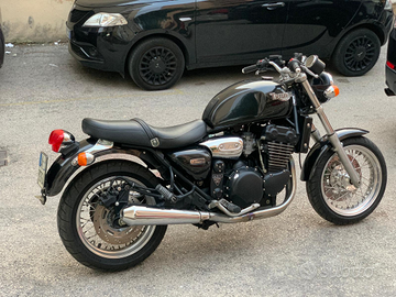 Professionista vende splendida triumph legend 900 tre cilindri del 99, perfetta pochissimi km meno di 20.000 , derivata dalla thunderbird 900, pochi esemplari in circolazione, moto di sicuro interesse collezionistico e notevole rivalutazione nel tempo, tutta originale mai toccata, iscrivibile asi per polizza ridotta 150 euro e bollo ridotto, condizioni impeccabili sia di motore che di carrozzeria che di cromature, completamente originale, ferma da due anni è stata completamente rimessa a nuovo come da foto allegate, tagliando completo con olio bardahl, cambio olio freni , liquido refrigerante, carburatori rifatti nuovi e allineati a vacuometro, lavaggio radiatore, filtri nuovi, filtro aria k&n dall'irlanda, sosituita la centralina con una carmo modificata a causa di un noto difetto di quelle originali (costo 450 euro come da fattura in foto), forcelle rifatte con olio paraolio e parapolvere nuovi e lucidatura steli...insomma la moto è nuova come da uscita dalla catena di montaggio, costo del tagliando 1500 euro.