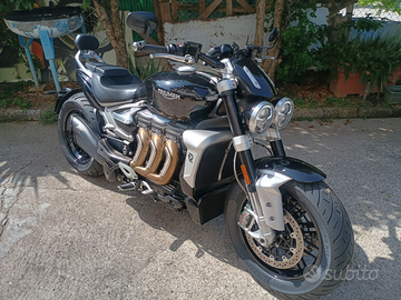Vendo splendida Triumph Rocket 3 R completa di : scarico completo Zard acciaio inox e carbonio Omologato con documento, poggia schiena passeggero originale, in dotazione anche porta targa per installazione Targa sotto il codino,completo di frecce e luce targa ,scarico originale, porta telefono con attacco a quadro strumenti moto.Sempre tagliandata concessionaria Triumph.