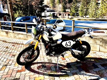Perfetta Scrambler. Sostituzioni scarichi con 2 terminali omologati aperti. Suono fantastico. Aggiunta faretti bassi. Predisposizione per presa usb consegna dei terminali originali nuovi Sella abbassata e rifatta in cuoio color marrone verde Km pochissimi perché mai tempo per usarla. Motivo della vendita. Km 23000