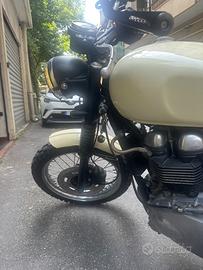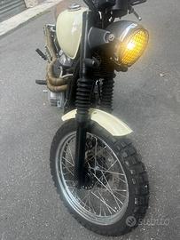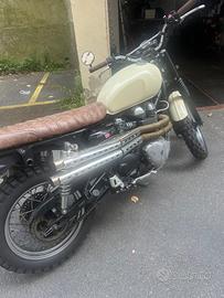 Triumph scrambler 900 anno 2006 a carburatori, trasformata nel 2021 da officina specializzata Milanese in cafe racer. Gomme tassellate nuove, colore serbatoio dipinto a mano (bianco/blu) ancora presente sotto wrap beige serbatoio, marmitte MASS, appena collaudata.