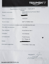 Come nuova, appena tagliandata (luglio 3025), i prossimi due sono gratuiti presso la concessionaria Triumph. Perfetta.