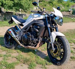 Vendo bellissimo esemplare di Triumph Speed Triple 1050 del 2009. La moto è stata sempre tenuta in modo a dir poco maniacale, sempre in garage sotto un telo di cotone, mai cadute, incidenti o pista. Tagliandi sempre eseguiti in Triumph Torino con tutta la documentazione neccessaria a corredo. Io sono il secondo proprietario dal 2012 e negli ultimo 4 anni la moto ha percorso appena 3000 km. La moto è perfetta in ogni suo dettaglio, nessun lavoro da eseguire se non un tagliando causa scarso utilizzo ma a quello posso provvedere io prima della consegna. A maggio dell'anno scorso ho montato Metzeler Sportec M7 RR nuove ancora praticamente immacolate, ho fatto rifare le forcelle e a settembre 2024 ho montato batteria Yuasa nuova ancora in garanzia. Nel 2021 ho fatto eseguire circa 3000 € di lavori tra cui sostituzione radiatore, illuminazione full led, terminale Zard, vari accessori Lightech, sottocoda completo Barracuda, ecc. Ovviamente dispongo di tutti i ricambi originali che cederò inclusi nel prezzo oltre ai telaietti per borse morbide SW Motech ormai praticamente introvabili. Possiedo manuale d'uso, libretto manutenzione e tutta la documentazione a corredo. Potrei dilungarmi oltre ma la moto va vista per rendersi conto che è perfetta. Per qualunque dubbio non esitate a contattarmi, dispongo di altre foto e posso darvi tutte le informazioni che vi servono