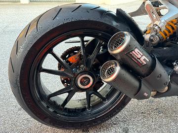 La moto monta scarico sc project doppio, porta targa evotech, tamponi para motore e tamponi ruota.