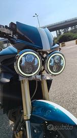 Triumph Street Triple 2009, modificata con manubrio, pare leve, specchietti, kit mono e molle forcelle, catena-corona e pignone con circa 4000 km, scarico Exan, codino in vetroresina, frecce, fari e luci posteriori LED. Verniciatura blu metallizzata. Porta targa artigianale con mini parafango.