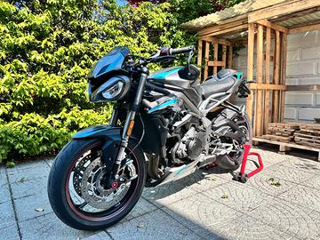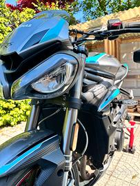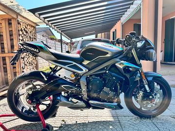 riumph Street Triple RS – 2021. La moto è stata immatricolata in maggio 2021 presso Triumph Padova e ha all'attivo 30.000 km circa. Ogni 1000 km pulizia totale della trasmissione e ogni 500 km leggera ingrassata. Dopo ogni giro la moto veniva pulita, messa sui cavalletti e coperta con telo. Bollo pagato fino a gennaio 2027. Revisione scadenza maggio 2027. Gomma anteriore M9RR 70%, posteriore 70% La moto gira come un gioellino. A 28.000 km è stato effettuato in casa il tagliando in autonomia pre stagione con: • 3,4 lt olio Motul 7100 10w40 • Filtro aria • Filtro olio • Liquido refrigerante nuovo • Pulizia manuale corpi farfallati • Check generale viterie Monta i seguenti accessori: • cuplino fumè • para motore • para telaio • para forcellone • nottolini cavalletto • para forcella anteriore e posteriore • portatarga Lightech • griglia radiatore • faro posteriore trasparente • grip tank • kit adesivi personalizzati • alcuni wrap in carbonio (da rifare) • scarico originale decatalizzato da una officina UK (no ZG Project) Presente purtroppo piccolo bozzo su serbatoio per caduta da fermo durante manutenzione. La moto per almeno un'altra settimana rimane con l'assicurazione disattivata, poi continuo ad utilizzarla quindi i km possono variare. Sono disposto a trattare in caso di interesse reale da parte del compratore. Massima serietà.