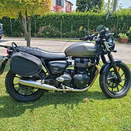 Vendo, per mutate esigenze, Triumph Street Twin 900 cc immatricolata 05/2021 km 18500, ultimo tagliando 02/2025, revisionata 05/2025, bollata fino gennaio 2026. Completa di borsoni originali (valore e.700,00), cupolino antivento, fari a LED, doppio cavalletto (centrale e laterale). Perfette condizioni tenuta maniacalmente. Prezzo leggermente trattabile Da vedere!
