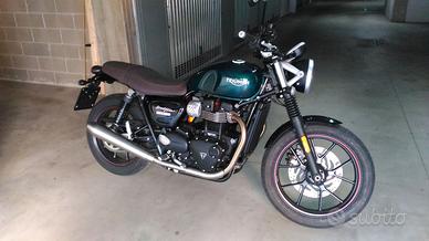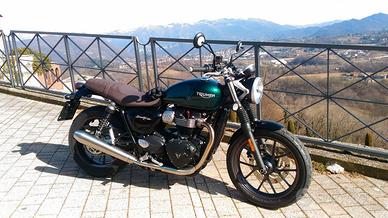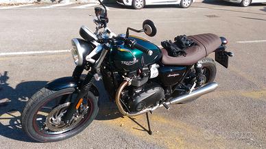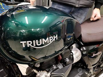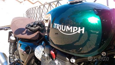 Verniciatura "Triumph competition green". Sella imbottita con gel, scritta serbatoio in alluminio in rilievo. Tutti tagliandi eseguiti regolarmente in Triumph. Sostituito tutto il gruppo trasmissione e pastiglie freni. Nessun incidente o graffio, la moto è sempre stata in box e forse non ha nemmeno mai preso la pioggia. Guidata come in un eterno rodaggio. No permuta.