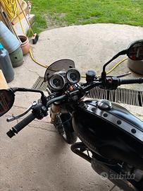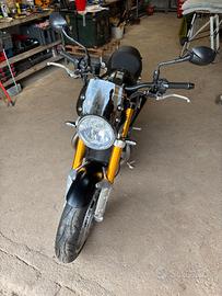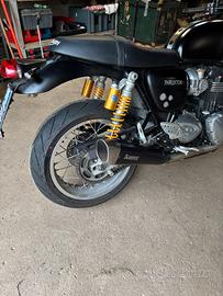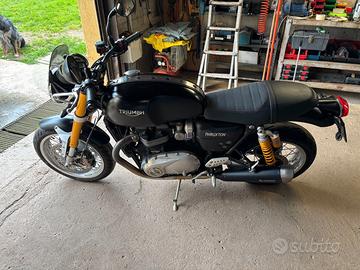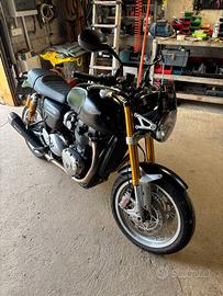 Vendo per inutilizzo Triumph Thruxton 1200 R notevolmente accessoriata, doppia cinghia reggi serbatoio (una forata, l'altra liscia), tappi olio, cupolino rialzato, cupolino fume, paracatena, frecce Led, paramotore, specchietti, scarichi Akrapovic acquistati per 1300 euro. Gomme Pirelli sostituite di recente. Possiedo tutte le parti originali. Tenuta maniacalmente.