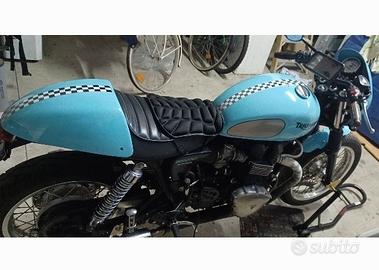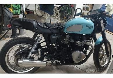 Triumph thruxton 900cc cafe rece al momento ferma al box sui cavalletti in attesa dell'estate