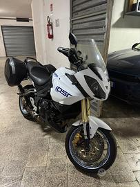 Vendo bellissima Tiger 1050 tenuta maniacalmente la moto possiede i seguenti accessori valige laterali originali, baule posteriore givi, para mani con led e freccie, specchietti in carbonio, cupolino lungo con prolunga aggiuntiva, cupolino corto ecc le carene sono state completamente riverniciate in bianco più forte per una questione di gusto personale con adesivi sul blu.non accetto scambi o permute no proposte assurde cambio per passaggio a modello di categoria differente