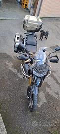 protezione carena alta, 3 attacchi borse originali, 2 borse originali Triumph, bauletto Givi, manopole e sella riscaldate, pedane da fuoristrada oltre a quelle normali, sella e moto regolabili in altezza.