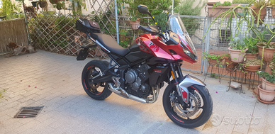 Tiger 660 super accessoriata, 7800 euro senza valige laterali e mono racing. Modello 2025 immatricolata a fine giugno con appena 3900 km, tagliandata a 1000 in triumph. La moto è accessoriata di monoammortizzatore Gubellini modello FQE31 con regolazione del precarico, estensione ed interasse con garanzia a vita; coppia valige originali; portapacchi originale, bauletto kappa 52 L
