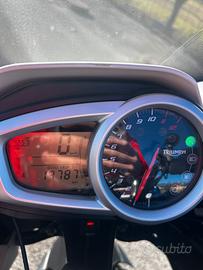 Tenuta da vero amatore, cupolino maggiorato Givi, bauletto originale Triumph in tinta, borse laterali Shad in alluminio satinato complete di borse interne.