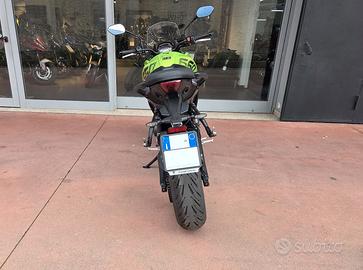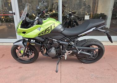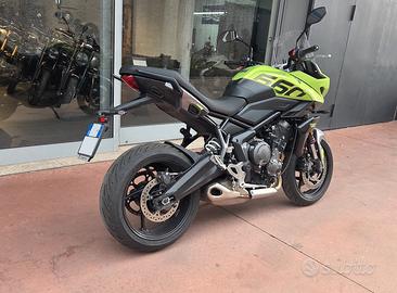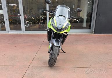 Triumph Tiger Sport 660 Colore Roulette Green Usata 02/2025 Km 2.500 Finanziamenti a Tassi agevolati Possibilità di consegna in tutta Italia Si Valutano Permute Motore e Trasmissione Motore Raffreddato a liquido, 12 valvole, doppio albero a camme in testa, 3 cilindri in linea Cilindrata 660 cc Alesaggio 74.0 mm Corsa 51.1 mm Rapporto di compressione 11.95:1 Potenza Massima (CE) 81 PS / 81 bhp (59.6 kW) @ 10,250 rpm Coppia Massima 64 Nm @ 6,250 rpm Sistema di iniezione Iniezione elettronica sequenziale multipoint con SAI con controllo elettronico dell'acceleratore. 3 modalità di guida (Rain, Road e Sport) Scarico Impianto di scarico 3 in 1 in acciaio inossidabile con silenziatore laterale Trasmissione finale Catena X-ring Frizione Frizione multidisco a bagno d'olio, assistita Cambio 6 rapporti Telaio Telaio perimetrale in acciaio tubolare Forcellone Bibraccio, in acciaio Ruota Anteriore Cerchio in alluminio a 5 raggi Tubeless 17 x 3,5" Ruota Posteriore Cerchio in alluminio a 5 raggi Tubeless 17 x 5,5" Pneumatico Anteriore 120/70 R 17 Pneumatico Posteriore 180/55 R 17 Sospensione Anteriore Showa 41mm upside down separate function cartridge forks, 150mm wheel travel Sospensione PosterioreShowa monoshock RSU, with remote hydraulic preload adjustment, 150mm wheel travel Freno Anteriore Doppio disco flottante da 310 mm, pinze radiali a 4 pistoncini, OCABS Cornering Freno Posteriore Disco singolo da 255 mm. Pinza scorrevole Brembo monopistoncino, OCABS Strumentazione e Funzioni Strumentazione multifunzione LCD con display TFT a colori integrato Dimensioni e Peso Larghezza Manubrio 834 mm Altezza Senza Specchietti 1398 mm / 1315 mm (posizione parabrezza alto / basso) mm Altezza Sella 835 mm Interasse 1418 mm Angolo di Inclinazione 23.1 º Avancorsa 97 mm Capacità Serbatoio 17.2 L Peso in ordine di marcia 207 kg Consumo di carburante 4.7 litres / 100 km (60.1 mpg) Emissioni CO2 **107 g/km Normativa EURO 5+. CO2 e