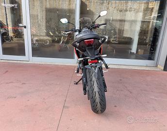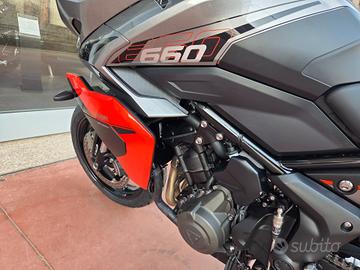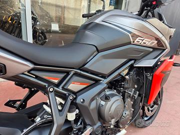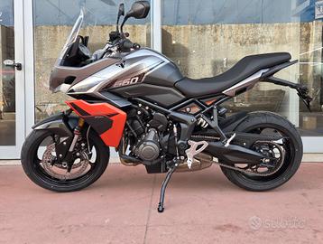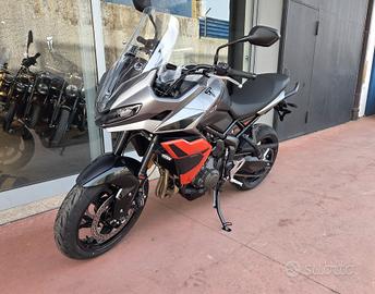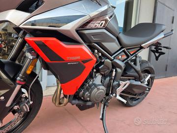 Nuova Tiger Sport 660 My 26 -Colore Silver Ice / Intense Orange -Nuova in pronta consegna -Consegna in tutta Italia -Garanzia Ufficiale Casa Madre valida 2 estendile fino a 4 anni -Finanziamenti a tassi agevolati tra cui: °Classico da 12 a 72 Mesi °Formula Welcome Back °Formula Con Maxirata Specifiche Tecniche Motore e Trasmissione Motore Raffreddato a liquido, 12 valvole, doppio albero a camme in testa, 3 cilindri in linea Cilindrata 660 cc Alesaggio 74 mm Corsa 51,1 mm Rapporto di compressione 12:1 Potenza Massima (CE) 95 PS / 95 bhp (70 kW) @ 11,250 rpm Coppia Massima 68 Nm @ 8,250 rpm Sistema di Iniezione elettronica sequenziale multipoint con SAI con controllo elettronico dell'acceleratore Collettore di scarico in acciaio inossidabile 3 in 1 con silenziatore basso in acciaio inossidabile Trasmissione finale Catena X-ring Frizione Multidisco in bagno d'olio, antisaltellamento, assistita Cambio 6 rapporti Telaio Telaio perimetrale in acciaio tubolare Forcellone Acciaio saldato, a doppio lato Pneumatico Anteriore 120/70 R 17 Pneumatico Posteriore 180/55 R 17 Sospensione Anteriore Forcelle a cartuccia Showa 41mm, a steli rovesciati con funzioni separate, corsa ruota 150 mm Sospensione Posteriore Monoammortizzatore Freno Anteriore Doppio disco da 310mm, pinze scorrevoli a 2 pistoncini, ABS Cornering Freno Posteriore Disco singolo da 255 mm, pinza flottante a pistoncino singolo, OCABS Strumentazione e Funzioni Strumentazione multifunzione LCD con display TFT a colori integrato Dimensioni e Peso Larghezza Manubrio 828 mm Altezza Senza Specchietti 1395 mm Altezza Sella 835 mm Interasse 1418 mm Angolo di Inclinazione 23,1 ° Avancorsa 97 mm Peso in ordine di marcia 211 kg Capacità Serbatoio 18,6 l Consumo di carburante 4,9 l/100km Emissioni CO2 Euro 5+